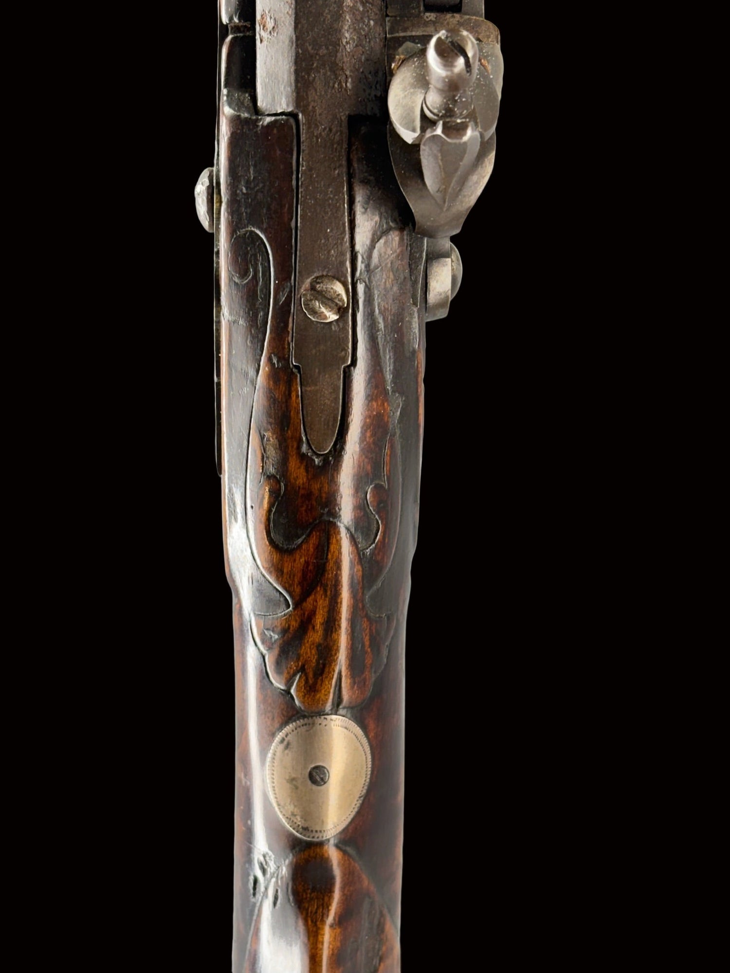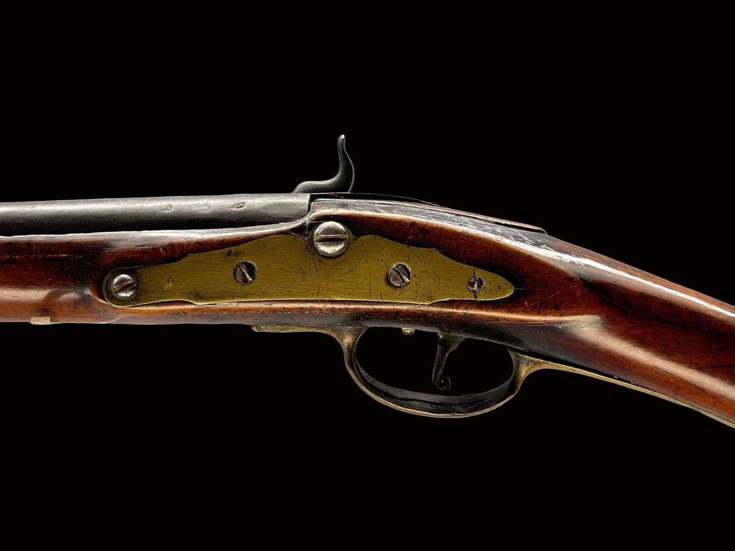 This is a spectacular rifle from the Susquehanna, Pennsylvania region. Attributed to Samuel Baum, one of the area’s most prolific gunsmiths, there is exceptional relief rococo carving decorating the tang, cheek, forestock moldings, and wrist. The octagon-to-round barrel is light and graceful; a wedding band sits at the transitional point.